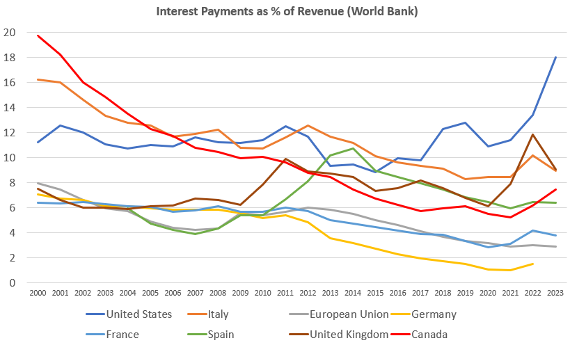[The] United States has in recent years outpaced other major developed economies to become the country with the largest debt-service burden. For example, when compared to Canada and major European economies, the US pays, by far, the largest amount of interest as a percentage of revenue. The trend in the US has been clearly upward since 2012, but surged well above peer countries after 2021. As of 2023, the US debt service amounts to 18 percent of total revenue.